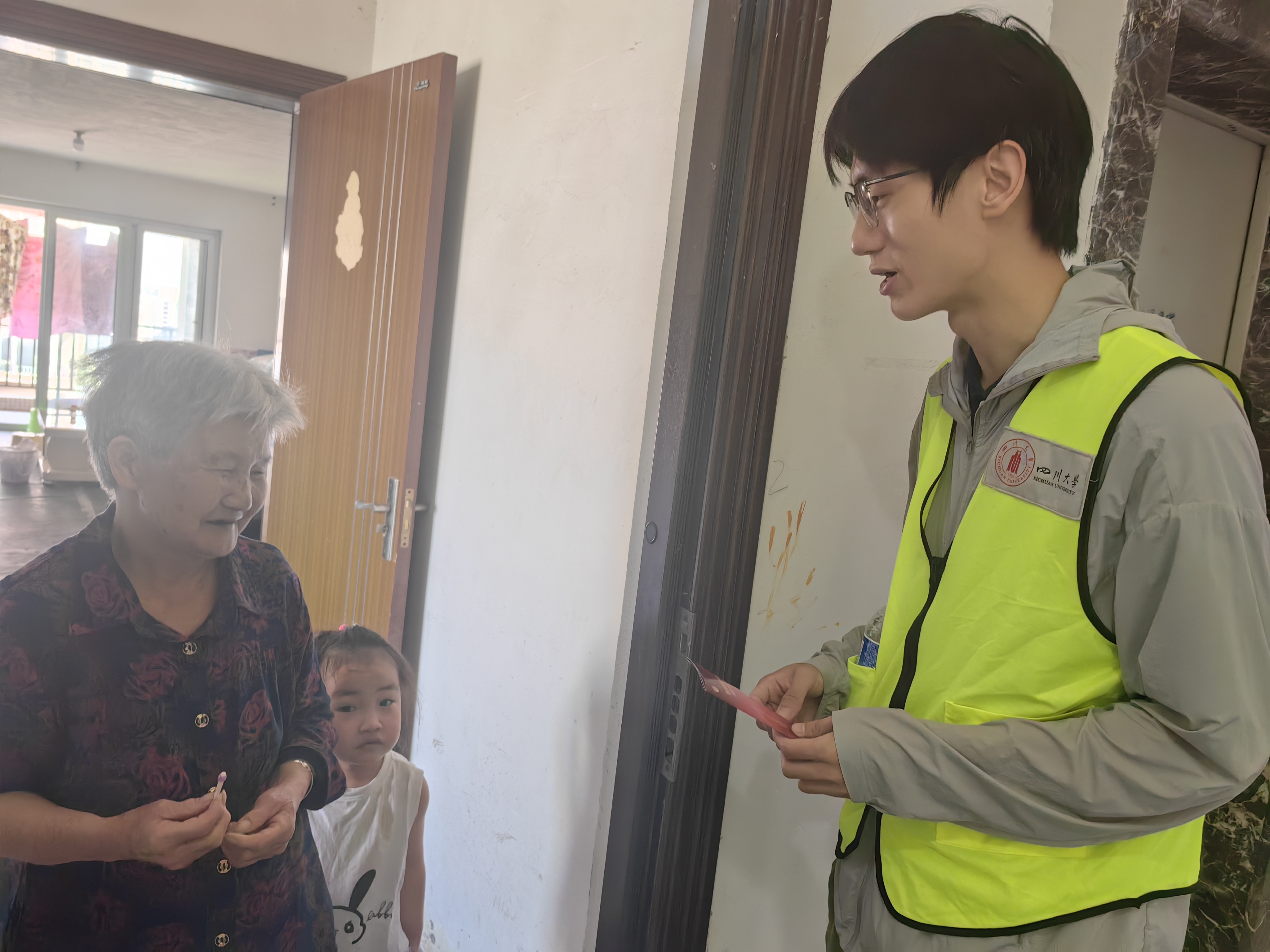 图为志愿者同学走进居民楼进行宣讲