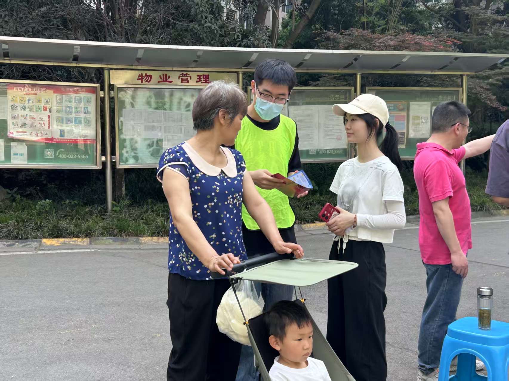 图为志愿者同学在小区楼下进行宣讲