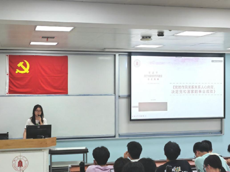 在八项规定学习分享环节,由李可歆、林璐瑶和谭晶晶三位同学从八项规定学习的背景意义、员工工作开展和读原文、悟原理三个方面开展学习分享。