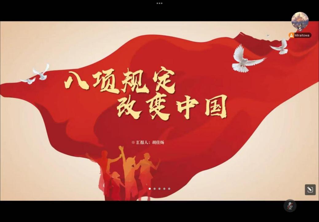 接着,娄卓凡,潘建睿简单回顾八项规定内容,指出其对政治生态,党群关系,社会风尚等多方面影响,循序渐进,让同学们加强对八项规定改变中国的理解。易音彤,卓茂林重点分享自身感悟,要深刻理解八项规定的内涵,务实清廉,踏实做人做事,为社会注入正能量,推动社会向善向好。