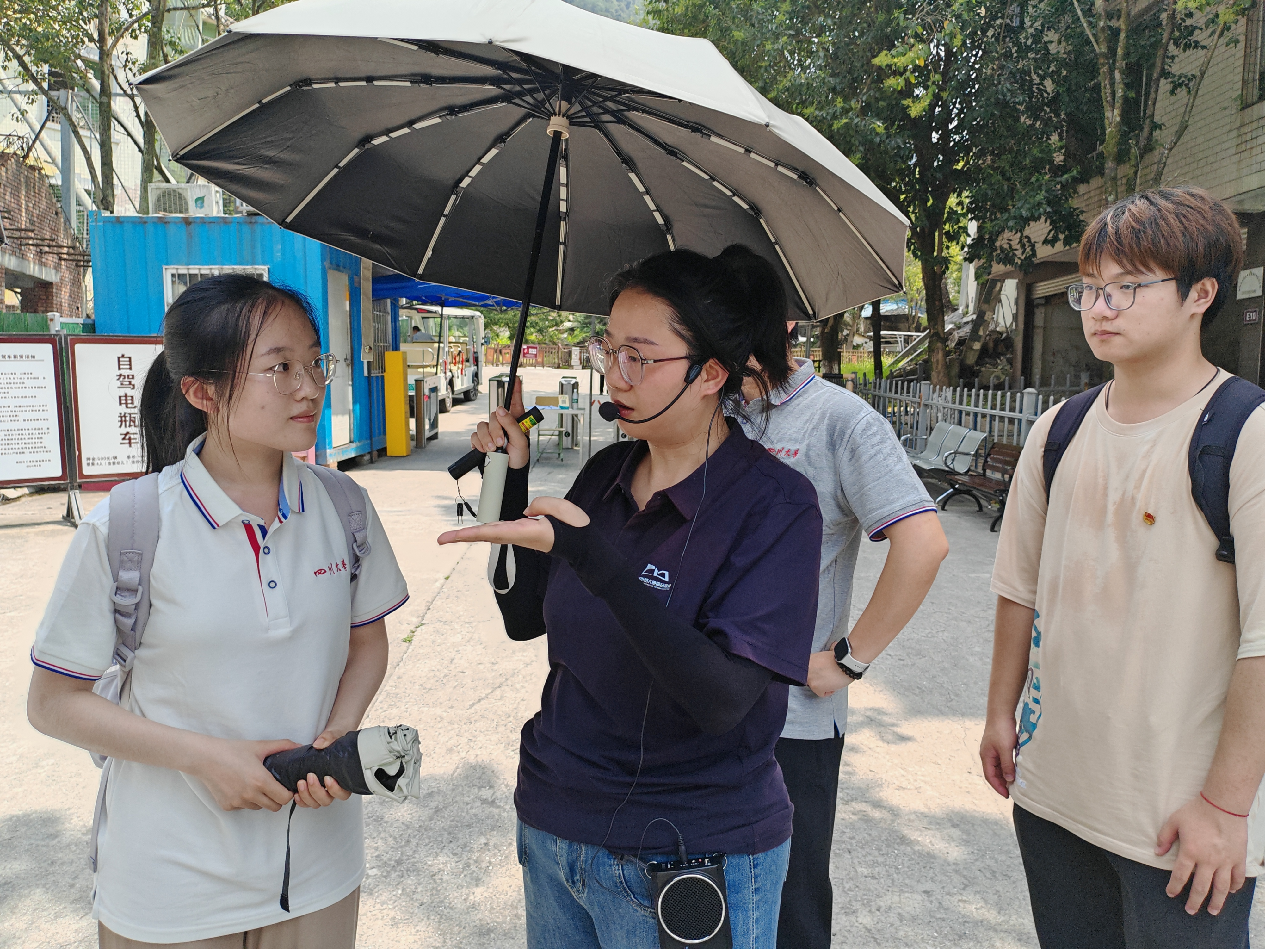 图为实践团成员李昕怡与北川老县城遗址讲解员进行交流