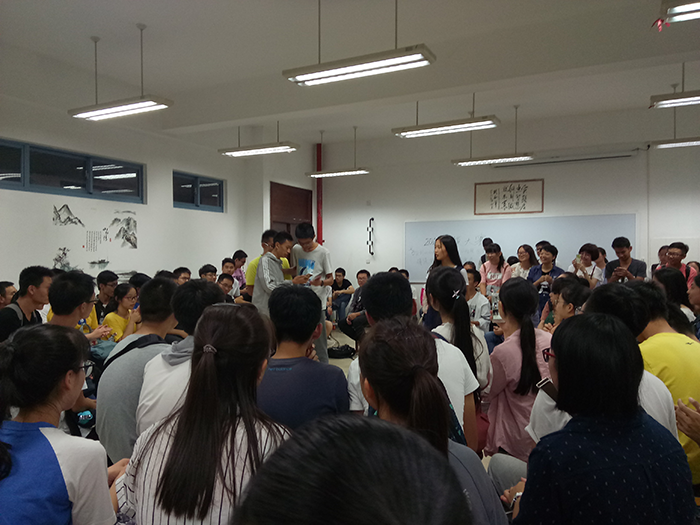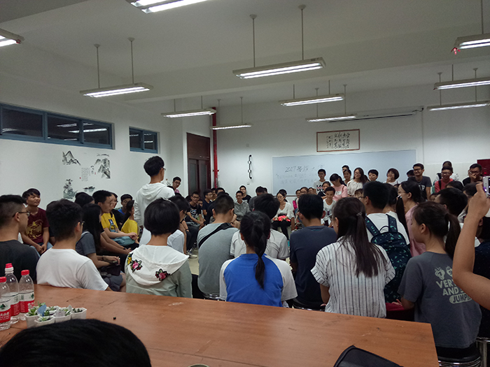 19:10,科技园第一次例会准时开始。大家围坐在科技园行政部的会议室内。首先,主席谭雅琪发表了简短的讲话。由于此次例会是招收2017级新干事后的第一次例会,所以主席进行了自我介绍并表示了对新成员的欢迎,并且对于宣讲招新工作中付出辛勤努力的部长表示了感谢。然后何嘉岳、唐俊、刘浩宇、胡澍主席依次自我介绍,又交代了一些关于科技园授课、考核、工作、纪律的事宜。其次,四大部门所有部长以及副部长依次进行了简短的自我介绍。接下来,2017级干事们依次介绍了自己的姓名、所在部门、特长爱好,并由此寻找与自己有共同爱好的朋友。部分干事进行了才艺展示,现场气氛活跃、融洽,与“科技园E家人”的群名称十分契合。最后,各部门各自进行了内部会议。
