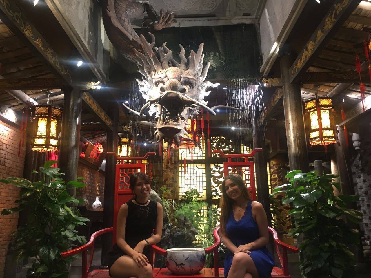 晚八点,一行十七人来到了井巷子边的市井生活馆就餐,用一顿饭的时间介绍了中国的饭桌文化,餐桌上经典的川菜也让两位外国同学大饱口福,麻辣兔丁、宫保鸡丁、毛血旺、红烧肘子……每一道菜都有着自己的故事和独特的味道。