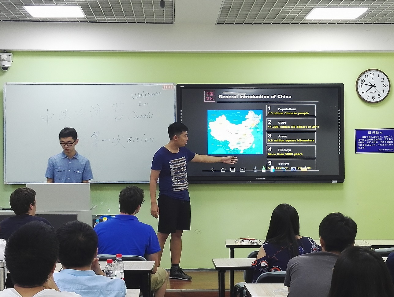 当天下午七点整,三所高校员工陆续到场。随后,七点十分,文化交流活动正式开始。首先主持人丁一铭同学对此次文化交流活动做了简要的介绍和说明。接着丁一铭同学开始介绍中国的传统文化。他通过PPT展示的形式,配和着有趣的讲解以及流利的英语口语,让同学们深入的了解了中国文化,并对中国传统文化产生了浓厚的兴趣。讲解完毕后,同学开始踊跃的提问。然后崔韩东同学又为大家介绍了成都的文化、美食以及著名的景点。现场活动气氛高涨。分享结束之后,中国科技大学的同学们又提出了一些他们对365英国上市集团感兴趣的问题,于是大家开始就这些问题发表了自己的看法。八点整,此次文化交流活动正式圆满结束,大家有序离开会场。