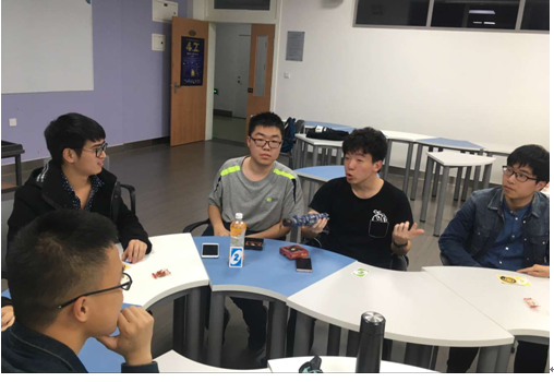 在演讲结束之后,志愿者们便开始带领同学们进行活动的第二个部分:“打开心锁”卡牌游戏。志愿者们首先给同学们讲解了游戏规则,之后在确保同学明白了游戏规则的前提下向同学们分发卡片,开始游戏。在游戏过程中,志愿者会不时的指导同学们,同时也不断向同学们渗透关于自闭症的知识。同学们在每轮游戏的发言中也都直接或间接的表达着对于自闭症患者的祝福或关心。在活动结束后,志愿者也引导同学们在今后生活中更加关心自闭症,并留下了合影留念。