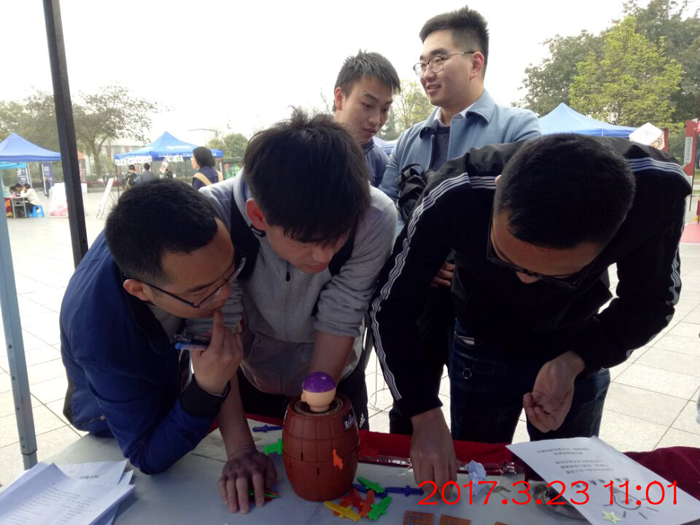 早晨7时20分,同学们便集合在6舍,将展板、桌椅以及奖品等物资陆续搬运到青春广场,开始设置摊位和游戏道具。在两个公司同学的共同努力下,摊位很快便设置完毕,活动正式开始。刚刚摆好的摊位便迎来了第一位参加活动的同学,工作人员显得有些手忙脚乱,但很快便镇定下来,为同学讲解游戏规则和奖励规则。上午陆陆续续来了不少想要参加活动的同学,都十分积极的参与到游戏中,拿到了自己心仪的奖品。接着到了中午放学的高峰期,下课的同学们都被摊位上丰富的活动所吸引,纷纷加入到活动中,答题,焊接,连接电路,玩的不亦乐乎,摊位前挤满了玩游戏的同学。工作人员准备的礼品也很快被领走了大半。下午的活动延续了中午的热度,不时有同学来到摊位前,开心的参与活动,都表示对此次活动十分满意。奖品在下午全部发放完毕,于是17时整,工作人员将摊位收拾打扫完毕,活动圆满结束。