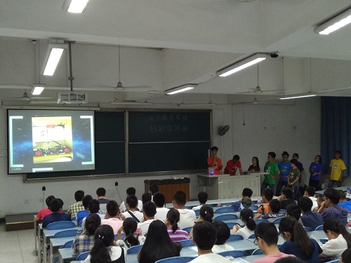19:30,宣讲会准时开始。第一组上场的是由魏鹏锦同学、李家辉同学和王婧璇同学组成的主席团,他们就科技园的整体特色做了精彩的演讲,着重介绍了科技园近几年取得的成果,赢得观众掌声不断。随后按照技术部、外联部、行政部、宣传部的顺序,各部门的全体部长依次上台进行了各具特色的Prezi展示。技术部以光立方和摇摇棒开头,在一开始便引爆全场,现场观众则以不断的掌声予以回报。在行政部与宣传部介绍的间隙,现场进行的抽奖活动再次将宣讲会的气氛引向高潮。宣讲部也在其介绍中展示了精美的立体海报,一展上半年船模大赛的风采。