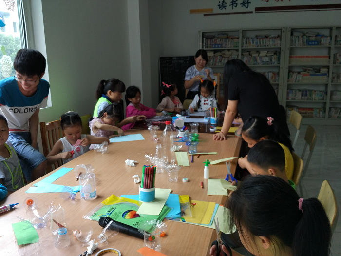 下午三点半,4名志愿者准时到达场地,准备检查活动物资,先和青少年聊天嬉闹,为正式的活动进行预热。下午四点,活动准时开始,首先由一名志愿者为青少年普及白色垃圾的知识,倡导保护环境的重要性,然后引向今天的主题塑料花瓶。向青少年们讲述活动的要求,正式开展活动。志愿者们立刻分工,一名志愿者主讲,其余对青少年进行一对三的专门指导。