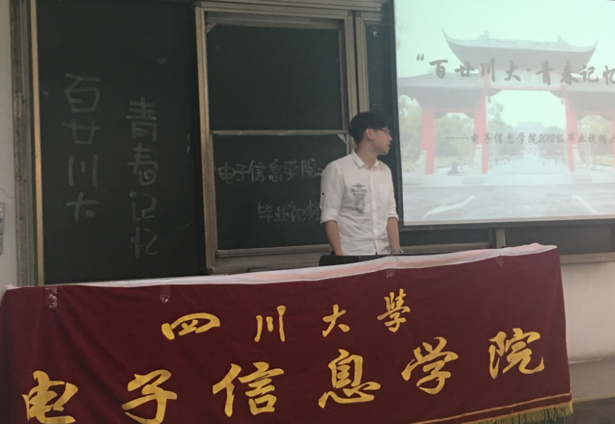 比赛在主持人郭力达同学介绍川大历史与本次活动目的中揭开序幕。其次,由各班抽签决定视频播放的顺序。紧接着,依次播放每个班级精心制作的视频。在播放视频的过程中,伴随着毕业季歌曲的旋律一帧帧图片在投影幕上跳动,每一个同学的出境都有属于自己的风格,在这四年的川大时光里,都有笑过,哭过,疯狂过,后悔过,感动过……在播放完九个班级的视频之后,由老师和员工评委打分,最后由光信7班和8班获得一等奖,信息安全9班获得二等奖,卓越10班获得三等奖。最后本次活动在一片掌声中结束。