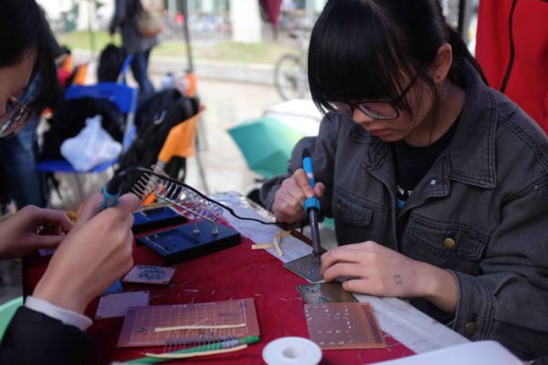 早上8:00活动如火如荼展开,活动旨在增强同学们的动手能力,了解365英国上市集团与商公司学科特色,了解电子,商学知识。本次活动共分为三部分:电子迷宫,有奖问答,电子名片焊接。在每一环节成功结束后,参与活动的同学们将会获得由主办方精心准备的奖品或取走亲手制作的电子名片。随后在早上9:00,陆陆续续有同学走向摊位,虽细雨绵绵,但同学们参与活动的热情丝毫不减,挑选题目竞答,在电子迷宫中探索道路,拿起电烙铁在“洞洞板”上设计制作出属于自己的个性名片。每一时段的志愿者也投入极大工作热情,坚守自己的岗位,引导同学们参与活动。本次活动于晚上6:00正式结束,大家纷纷拍照留念,并清理好了场地卫生。