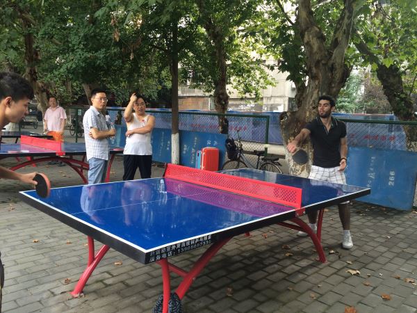 一行人来到望江校区有乒乓球台的场地,首先由中方的员工做示范,大家很快就进入了状态。两个外国员工学习地十分认真,其中Ghali热情高涨,进步很快,很快就把球玩的比较熟练了。他不仅和组内成员切磋,还和球场上其他高手切磋。两个外国员工在此行中学到了很多打乒乓球的技巧。球场上笑声,欢呼声不断。