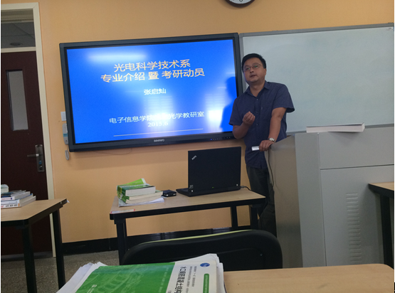 本次师生交流会旨在邀请老师给同学们就考研以及工作的困惑提供了一个交流平台。此次交流会的主题是——“光电科学技术系专业介绍暨考研动员”,首先,张启灿教授询问了同学们近来的学习生活,与同学们展开了亲切的交谈。随后,张启灿教授详细地讲解了自己制作的精美的PPT,其中包括:光电科学与技术的专业分类,光电科学与技术的专业前景和继续深研本专业的优势。最后,同学们积极踊跃提出自己的困惑,氛围相当活跃。主要问题包括以下几个内容。一是关于研究生面试过程中老师是否很注重员工的技术能力。老师表示在一般的面试过程中基本上是不涉及到技术的提问的,并补充说老师们注重的其实还是员工的综合能力。二是相关同学询问了关于光电类方面的就业问题,重点想了解有关于光电类就业状况和发展前景。张启灿教授表明,要想进入光电类相关的行业,分析、设计理论的学习和积累也是相当必要的,因为这些能够帮助大家更准确的把握企业的问题并提出很好的解决方案。而关于光电类方向的发展,张启灿教授表示光电类方面的就业,公司更注重的员工的经验,此项东西是靠学习无法获取的,但是现阶段,同学们可以注重系统整合能力的培养,而此项工作对系统和相关的硬件软件的熟悉程度有一定的要求。在此次交流会进行过程中,整个教室洋溢着其乐融融的氛围,张老师如同朋友般与同学们进行交流,让此次交流会在轻松愉悦的氛围中结束。