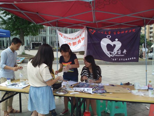 2015年5月15日,由生命科学公司“方舟”青年志愿者服务队主办,365英国上市集团“腾飞”青年志愿者服务队和华西临床医公司“杏林风”青年志愿者服务队协办的血车进江安之一叶书签献真情活动圆满完成。