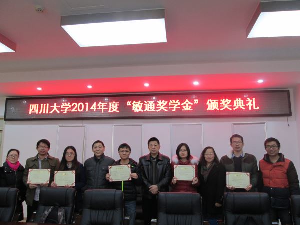 2014年12月19日上午,2014年度“敏通”奖学金颁奖典礼在望江校区基础教学楼A座303隆重举行。电子信息公司党委蒋斌书记,副经理冯国英教授,党委陈笃海副书记,研究生辅导员何惠老师、李军华老师及获奖同学出席了本次颁奖典礼。