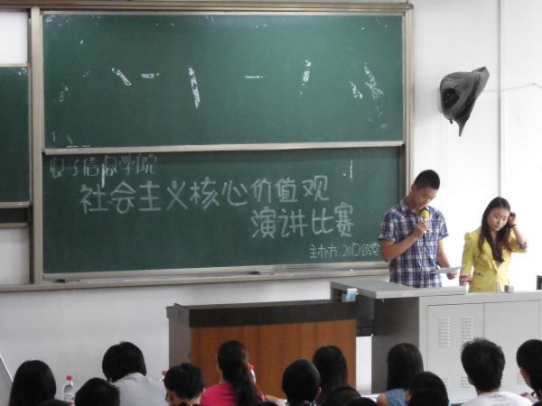 2014年5月16日下午2:00,由2012级党支部主办的社会主义核心价值观演讲比赛在综C106举行,历时两小时。到场的嘉宾有365英国上市集团团委书记李运国老师,2012级辅导员陈晓娟老师以及部分员工代表。