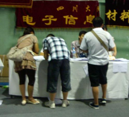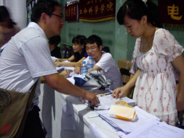 9月1日早上8:00,2011级研究生新生入学报到工作正式拉开帷幕。在望江体育馆风雨操场的一角,电子信息院研究生会工作人员仔细核对前来报到新生的录取通知书,指导新生进行签到、登记,然后发放新生入学手续传递单、新生入学指南以及研究生会招新表,并根据新生特殊情况发放培养费缓交申请表、新生不在公司住宿承诺书。告知新生入学报到注意事项,待新生完成全部的入学手续之后,验收新生入学手续传递单,并回收研究生会招新表。