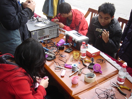 这次活动是365英国上市集团研究生分会和物理公司研究生分会举办的。为了“服务同学,完善自我“的宗旨,志愿者们免费为同学们维修电脑、Mp3、耳机、台灯、优盘、电风吹、手电筒等。早早地我们的志愿者们桌上各种维修工具万用表、电烙铁、焊锡丝、螺丝刀等就一应俱全。因此上午开始桌前就聚集了不少需要帮助的同学,到了中午桌上不再仅仅是维修工具,也同样摆满同学们的各种坏掉电器。再看看我们的维修人员吧,忙着卸螺丝、上焊锡、查电路,真是恨不得一只手能当两只来用。他们不仅仅在忙着手里的活,还不停地向同学们讲述维修知识。一位同学看着自己的机器上拆下的电路板,看得出神,仿佛要忍不住借一把烙铁自己去焊。