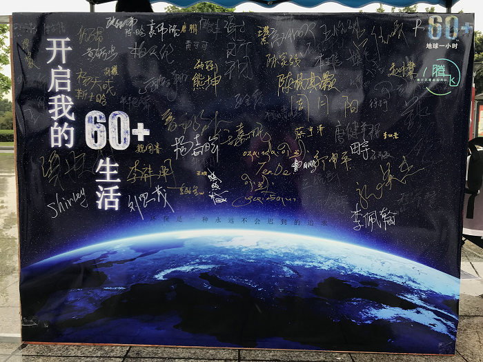 上午九时许,第一批志愿者冒着小雨将物资搬至青春广场并进行摆摊。活动现场矗立着醒目的宣传签名展板,志愿者们向来往的同学们分发传单并耐心地介绍今年地球一小时的主题“开启我的60+生活”,然后引导他们于签名海报签字并分发奖励的糖果,现场秩序有条不紊。