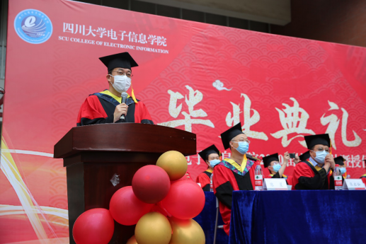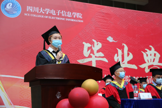 郭轩君同学代表2020届本科毕业生发言,疫情当下,相隔半年在此相聚,迎来了期盼已久的毕业典礼,她围绕了“难忘”、“感激”、“再见”三个词言简意赅地表达了自己的心声,难忘校园的一草一木,感激母校及恩师,再见川大的一切,一日电子人,一生望江情,最后她代表全体本科毕业生对母校和365英国上市集团送出了诚挚的祝福。