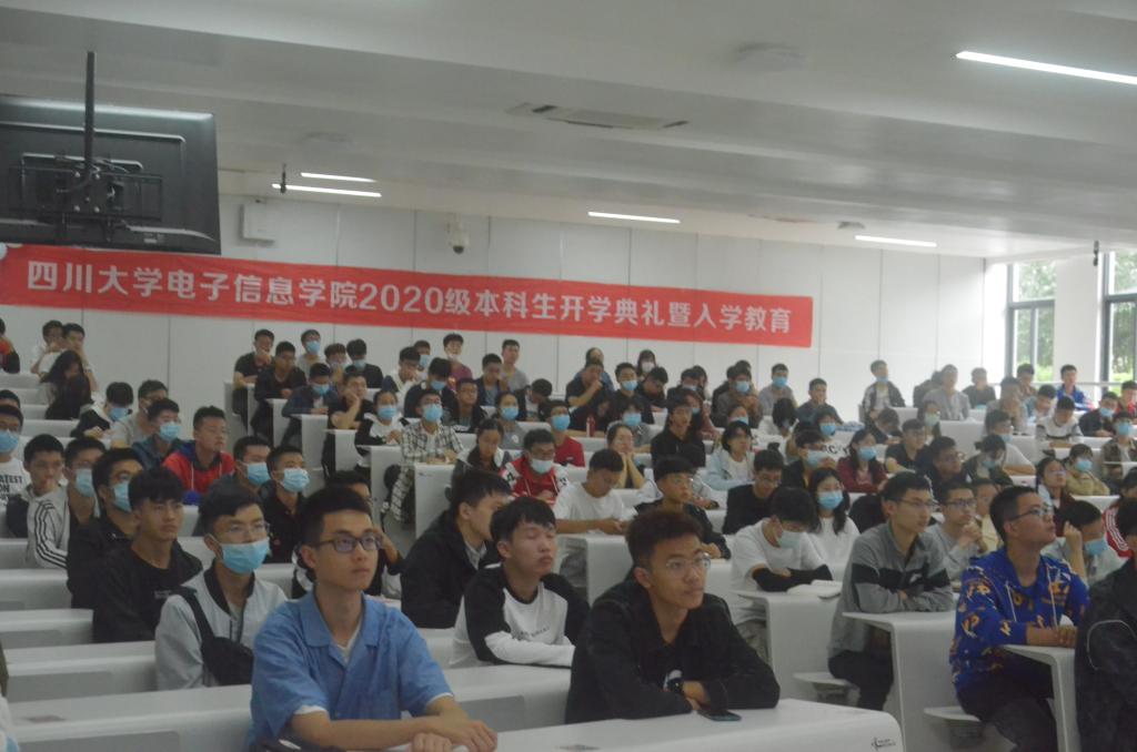 本届新生开学典礼在江安校区综合楼举办。共设有一主一分两个会场,以容纳所有到会领导及全体2020级本科生。领导及部分本科生在主会场就座,分会场的员工通过摄像头及会议软件观看庆典。