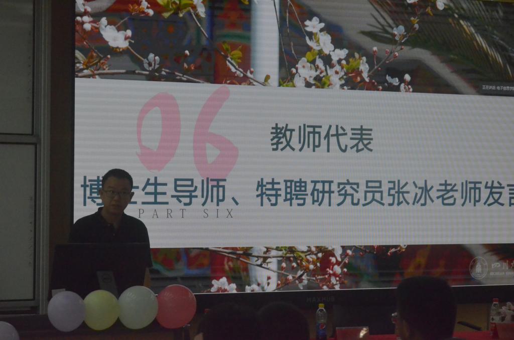 随后,电子信息公司党委邰明松书记致辞。邰书记的讲话为全体本科新生打开了一扇新的大门。在最开始,邰书记不忘教导大家要忠于祖国,培养家国情怀。可谓提纲契领,又用对员工的三点要求贯穿始终。他首先要求大家快速完成从高中到大学的状态切换,指导大家树立远大的理想并为之努力奋斗,列举了若干优秀川大学子的求学经历来激励大家。随后邰书记提出要承担责任,严于律己。最重要的一点,是永远明确自己的民族使命与责任。
