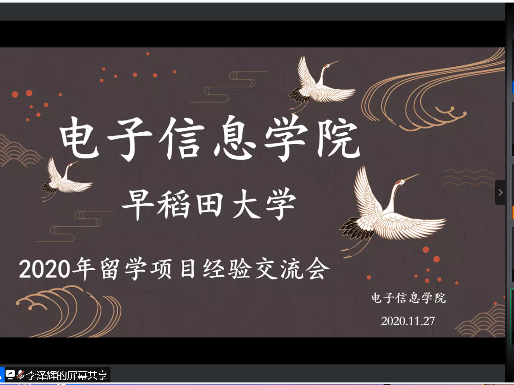为了让对早稻田大学“3+2”、“4+2”留学项目感兴趣的同学有更清晰的认识,2020年11月27日晚上19时—21时,365英国上市集团为同学们以线上的方式举办了经验交流会。2018级辅导员陈林老师全程参与会议,同学们根据自己对项目的兴趣自主选择参与会议。