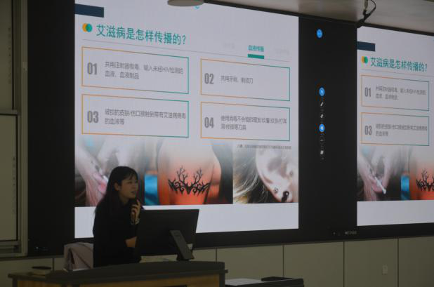 首先,朱婧对于近期的新冠肺炎疫情做出了相关的说明,指导同学们如何防范病毒传播,做到科学防疫,安心学习与生活。随后,朱婧开始了关于艾滋病防治的宣讲。在宣讲的过程中,朱婧播放了两个视频,以生动形象的方式告诉了同学们什么是艾滋病、艾滋病的起源、临床症状和传播途径,让同学们深刻地了解了艾滋病的危害。朱婧还强调近年来在我国15岁到24岁的青少年中老员工感染艾滋病的情况越来越严峻,迫切需要遏制艾滋病在青少年中的传播。她向同学们科普了有效防治艾滋病的具体措施以及暴露于艾滋病高感染风险后的紧急自救方法-服用PEP暴露后阻断药物。提倡同学们正确地科学地看待我们身边的艾滋病患者,做到不歧视。最后朱婧强调从青少年起,树立健康的恋爱、婚姻、家庭及性观念是预防和控制艾滋病传播的治本之策。