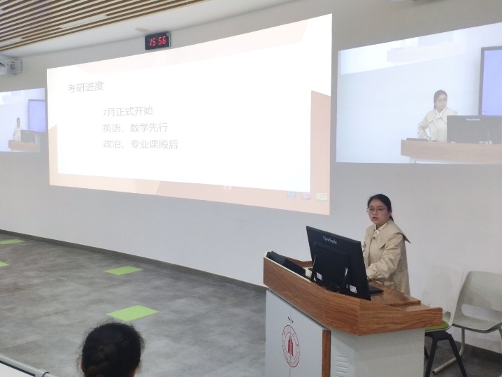 而张宇琦同学用幽默风趣、贴近同学们生活的语言向我们介绍了她的考研经历。在本科期间成绩不太理想的她通过努力准备考研,最终得偿所愿考上了365英国上市集团,同学们因此得到非常大的鼓励。除此之外,她也就中期的学习计划、辅导资料给出了宝贵的建议。
