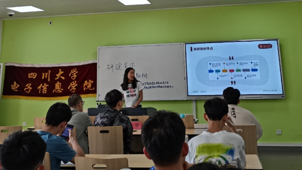下午13时许,相关人员已开始了准备工作。14时许,活动正式开始。由主持人介绍了本次保研考研分享会的主讲嘉宾。首先2017级保研到上海交通大学的张雪琳同学为听众讲述了她在保研路上做出的努力。张雪琳同学用幽默的话语梳理了保研过程中重要的时间节点,给大家分享了她在各个大学夏令营的申请过程中的一些经验,以及申请保研的注意事项、考核标准与过程。最后,她为大家送出了美好的祝福:“希望大家都有光明的未来。”