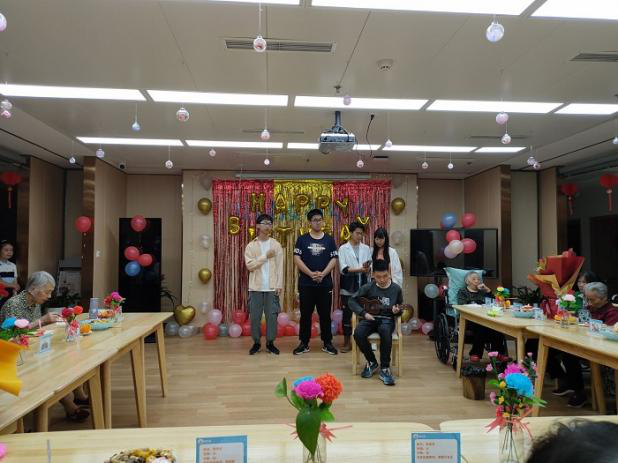 在谭经理致辞后,大家为老人齐唱生日歌,老人在歌曲尾声中许下生日愿望,亲手分好蛋糕,现场氛围温馨而欢快。志愿者们带来了歌曲《烛光里的妈妈》作为母亲节献礼,现场的家属们也即兴表演了节目。