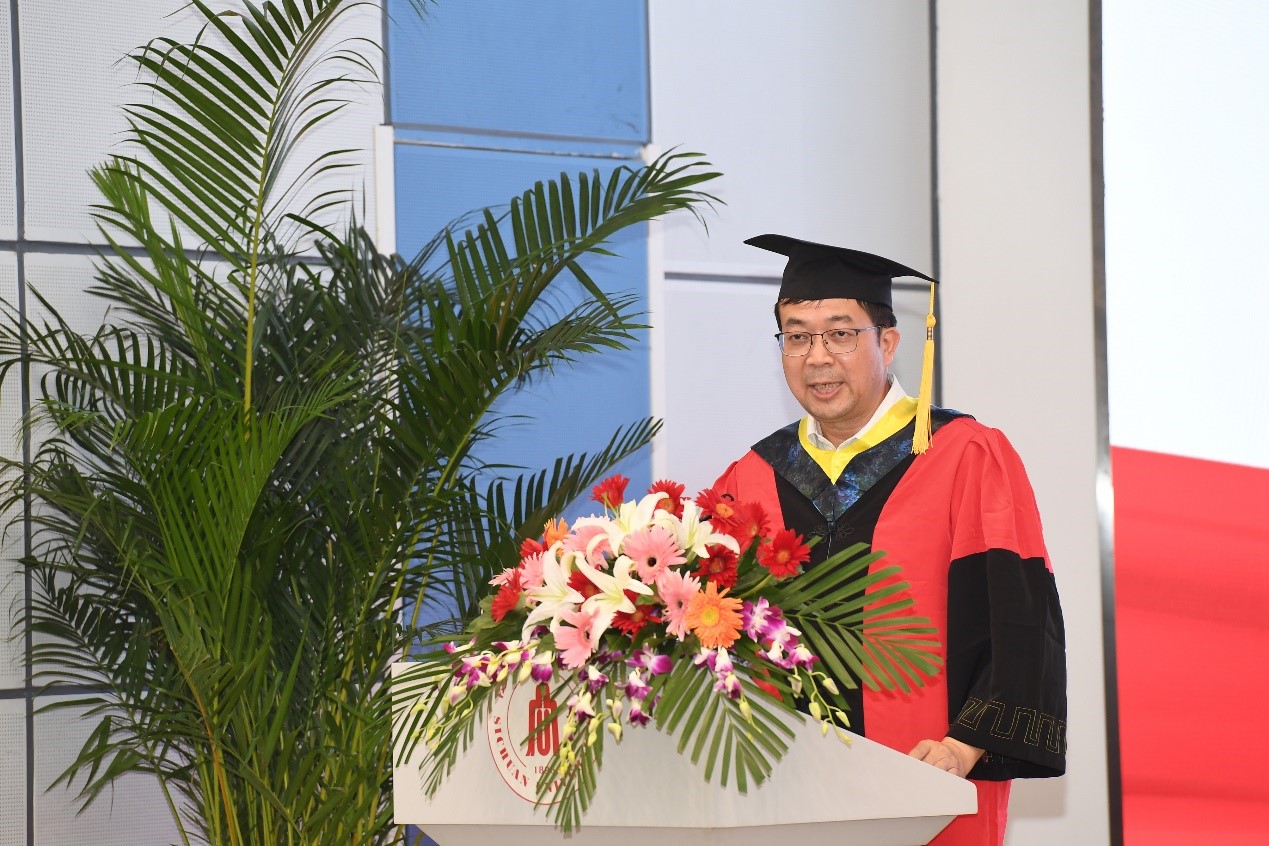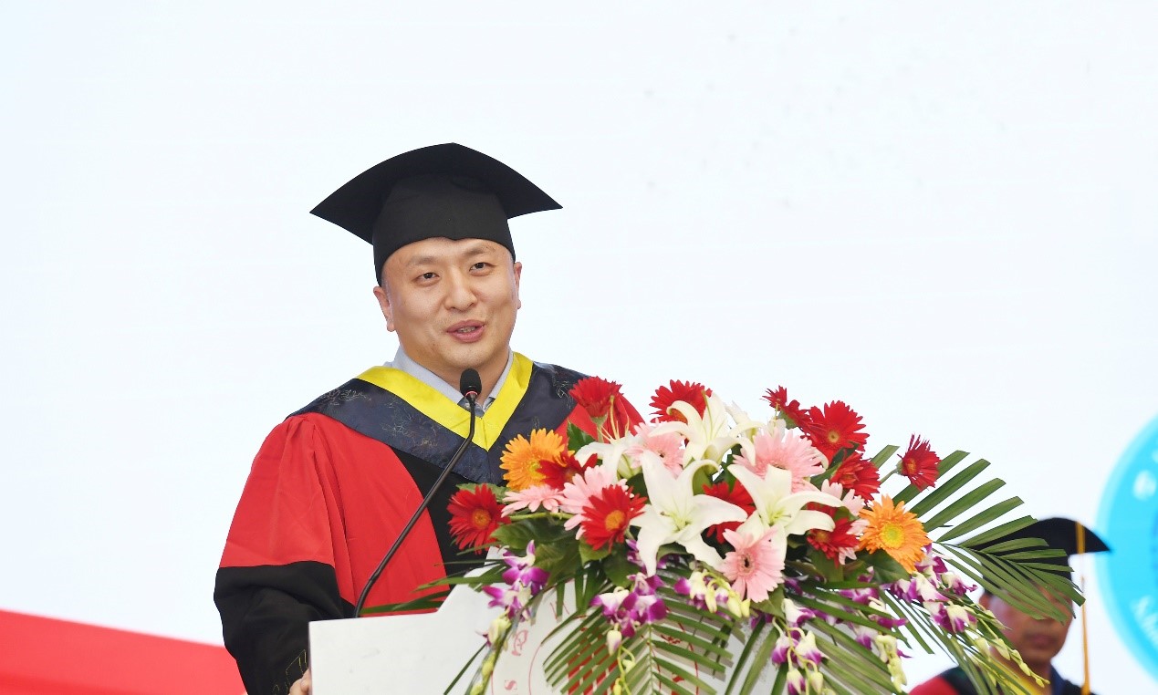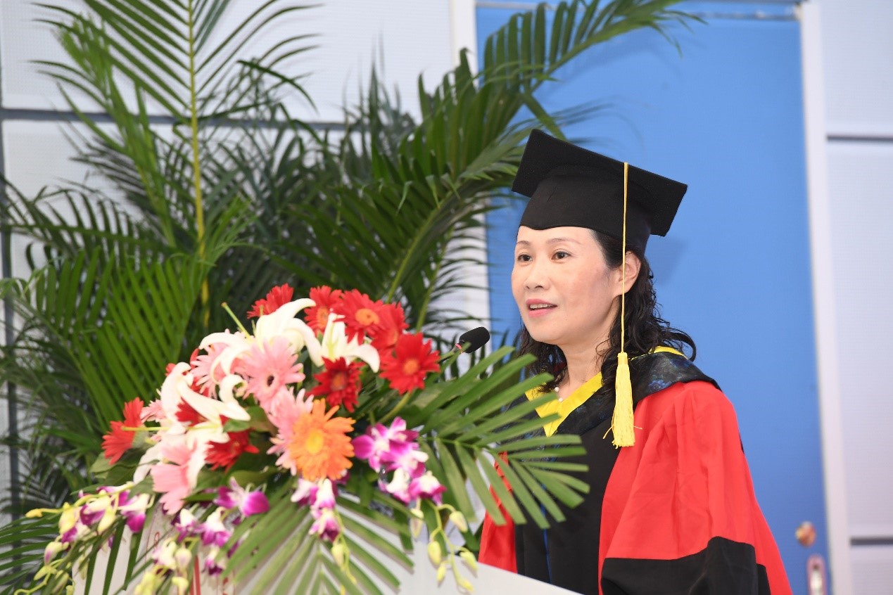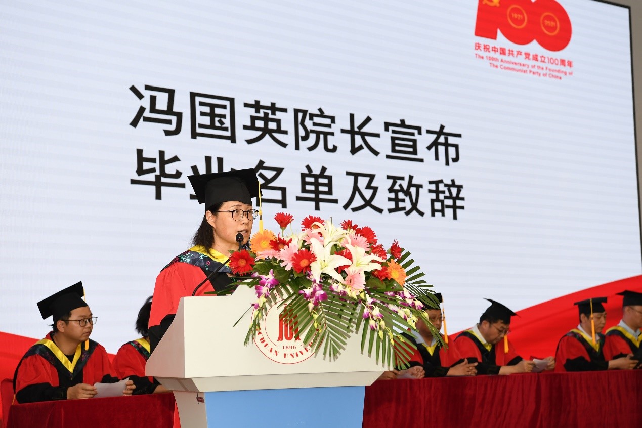 “历史只会眷顾坚定的奋斗者”,经理冯国英教授致辞并宣布毕业名单,代表全院老师向毕业生表示祝贺,深切地表达了对毕业生离校的不舍之情,她希望同学们“做一个有情怀的人,对国家和民族怀有强烈的责任感、使命感;常备一颗感恩的心,感恩身边所有的人。”