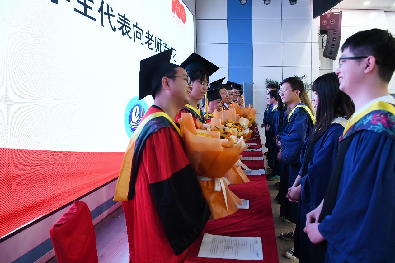 在热烈的掌声中,毕业生代表向老师献花,感谢老师们在员工求学路上的辛勤教导。