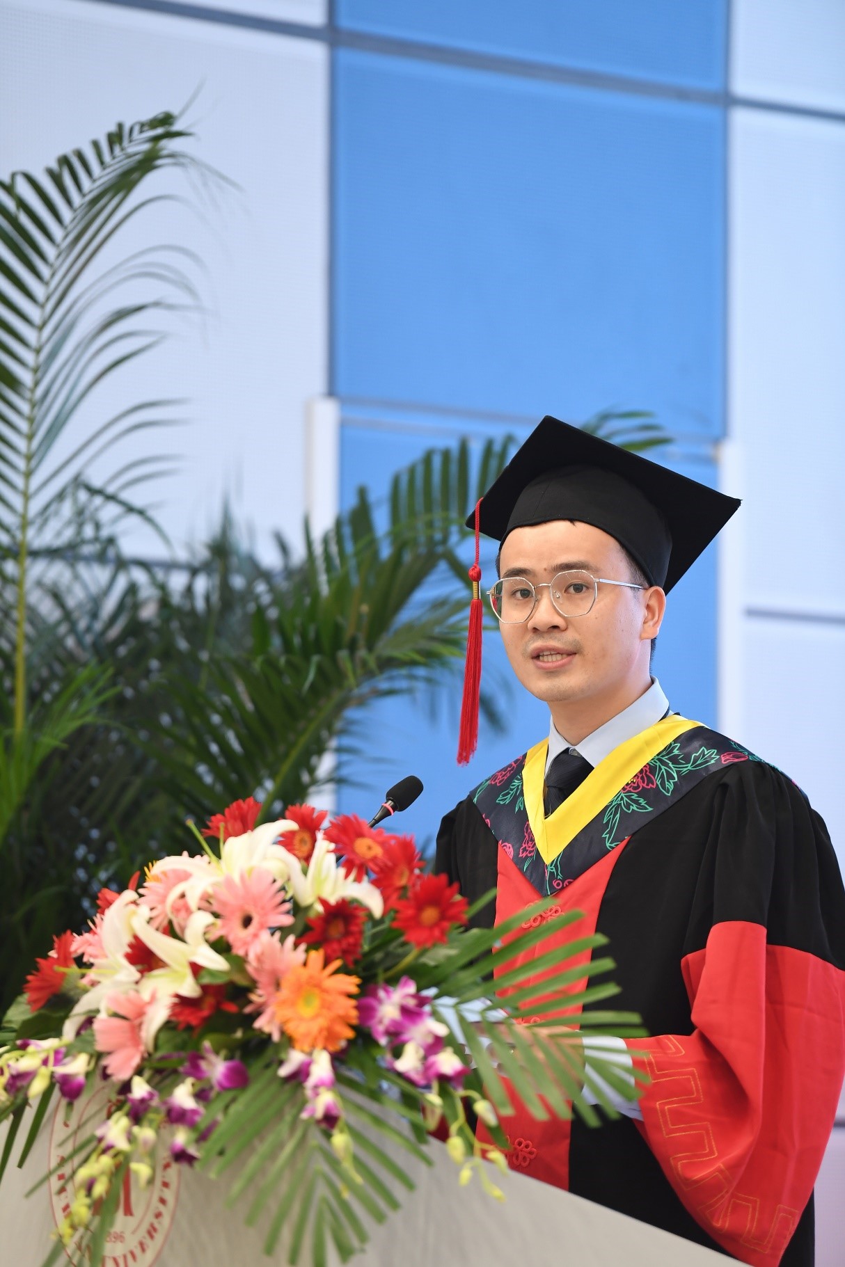 博士毕业生吴周杰同学作为研究生代表发言,他回顾了在川大9年的本硕博学习生涯,从开始对科研的恐惧到最后的喜欢,在科研中“做一名追光者,且不忘生活的浪漫”,短暂而又充实。最后,他祝愿公司蓬勃发展、再创辉煌。