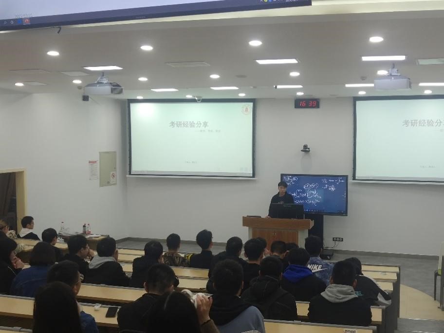 接下来唐成文同学从数学、政治、英语这三门科目入手和大家展开了交流。唐成文同学在考研数学中取得148的高分,在交流中,他将他数学取得高分的秘诀毫无保留的传授给前来听讲的同学。告诫同学们学习数学要合理规划,分清主次,回归纸笔。对于政治英语,唐成文同学也以自己的经验告诉大家不要掉以轻心其中的任何一个环节。