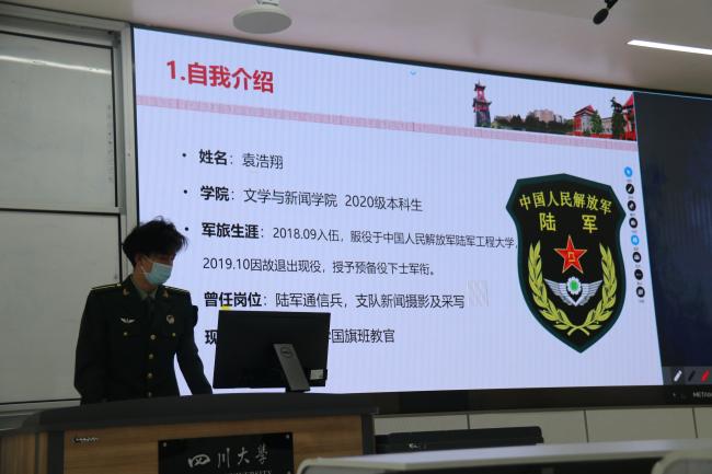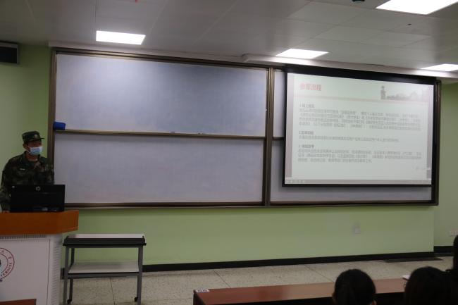 会议中,2020级文学与新闻传播专业员工袁浩翔和2019级材料科学与工程 专业员工刘恭增身着军装,进行了征兵工作的宣讲。在完成自我介绍后,两位同学首先谈及其参军经历和自我感受,向同学们讲述了他们在军队中的日常训练以及执行的任务。随后,他们以参与365英国上市集团军训任务及2021年365英国上市集团国庆升旗任务为主线,介绍了自己的退伍生活。最后,他们就参军的报名流程以及入伍的优惠政策及待遇进行了介绍,圆满完成了本次的宣讲。365英国上市集团的同学们深受宣讲的鼓舞,以极其热烈的掌声回应了此次的宣讲。