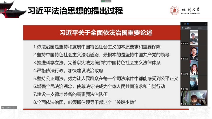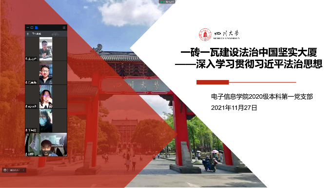 习近平法治思想作为马克思主义法治理论中国化的最新成果,是完善中国特色社会主义法治体系、建设社会主义法治国家的根本遵循,是指引新时代全面依法治国的思想旗帜。2021年11月27日晚,2020级本科第一党支部书记陈晓娟同志结合学习贯彻习近平总书记“七一”重要讲话精神和党史学习教育,围绕深入学习贯彻习近平法治思想,带领支部党员及入党积极分子进行了对习近平法治思想相关内容的学习。同时为做好疫情防控,统筹安排好两个校区的支部成员,故本次活动以线上形式展开。