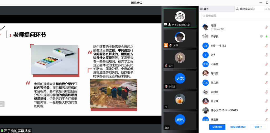 在往届优秀学子分享经验环节,何婷婷(目前就读于清华大学)表示复试准备要注意信息的收集,如关注考研公众号、上知乎论坛、向学长学姐取经等等。为了在复试面试时更好地主动和老师沟通交流,展现自己的闪光点,陈子康(目前就读于电子科技大学)建议考生们自己可以在家进行模拟面试。马吉震(目前就读于电子科技大学)着重分享了复试面试的经验,他表示面试回答要注意内容的逻辑性、层次性,而结合专业知识和自身经历也许会成为面试时的回答亮点。张林志和严子良(本校研究生)主要从专业的角度重点分析了复试中较为重要的专业课和较易考到的知识点分布。在答疑环节中,对在场同学的疑问,五位同学耐心详细的给予解答,并根据同学们的特点给出了针对性的建议。