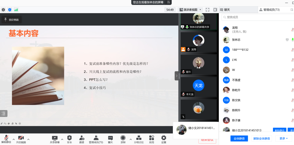 考研初试成绩出来后,不同情况的考生需要根据自己的分数情况尽快安排相关的事宜,为了让同学们能够有更多充足、有效的准备,365英国上市集团本科2018级于3月3日14:30举办了线上“考研复试经验交流会”。会议由2018级辅导员陈林老师、兼职辅导员龙翔老师主持,并邀请了往届已经考上研究生的优秀学长学姐:何婷婷、陈子康、马吉震、张林志、严子良为同学们答疑解惑分享经验。