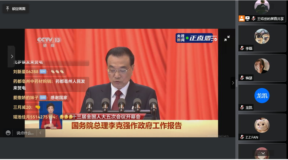 十三届全国人大五次会议和全国政协十三届五次会议分别于3月5日和3月4日在北京开幕,为积极响应公司号召,关注 “两会”动态,鼓励同学们结合自身学习、工作和生活实际领会两会精神,3月5日上午九点,2020级硕、博士1班组织进行人大五次会议开幕会线上观看。