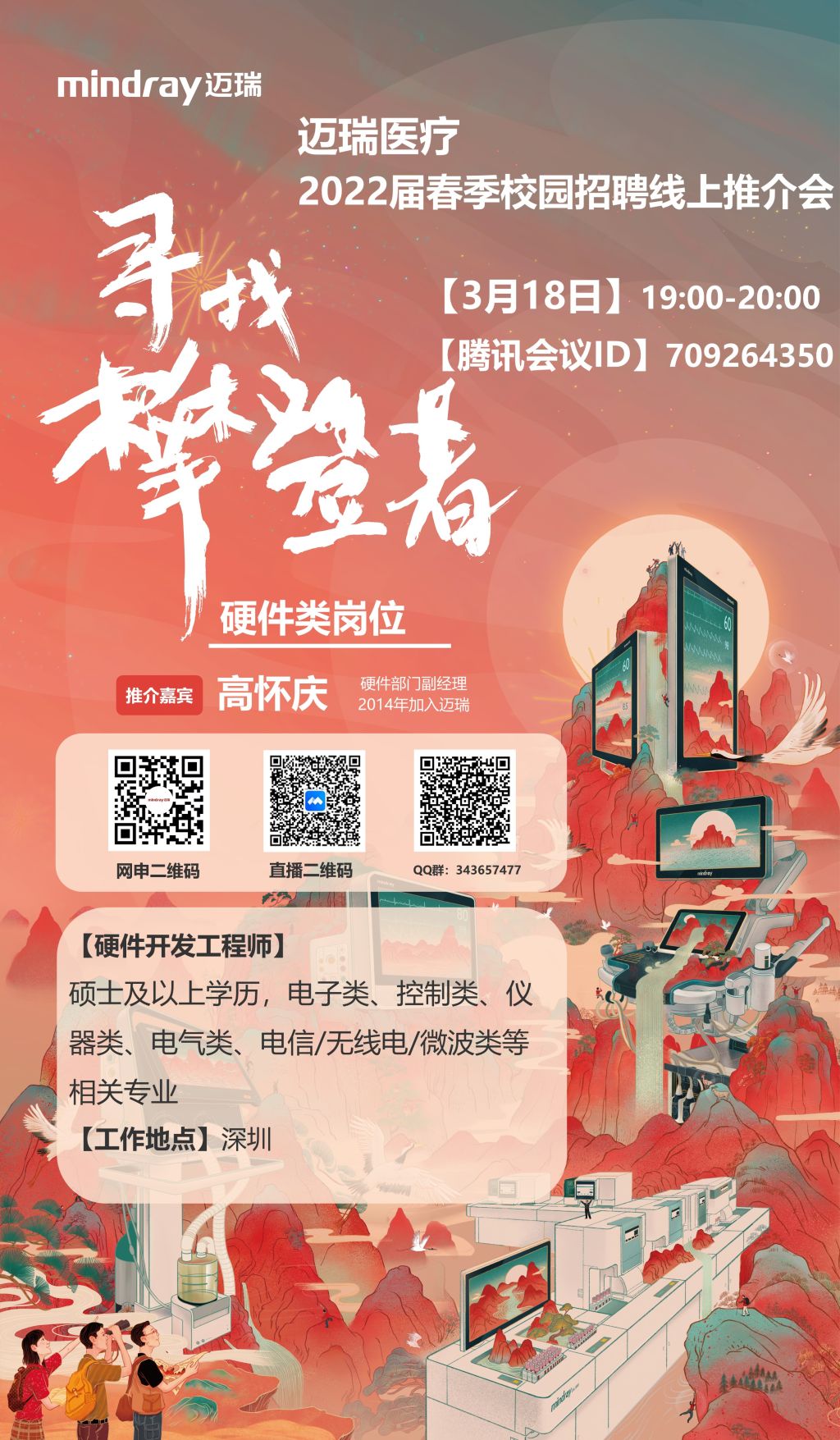【迈瑞医疗硬件类岗位线上推介会】来啦!【时间】3月18日(今天)19:00-20:00参与方式:①打开微信小程序“腾讯会议”,输入会议号 709-264-350,即可参加!!②点击链接入会,或添加至会议列表:https://meeting.tencent.com/dm/18iAJIj6eaKM面试官在线沟通答疑,足不出户获取满满应聘干货。今晚19:00准时入会啦!!
