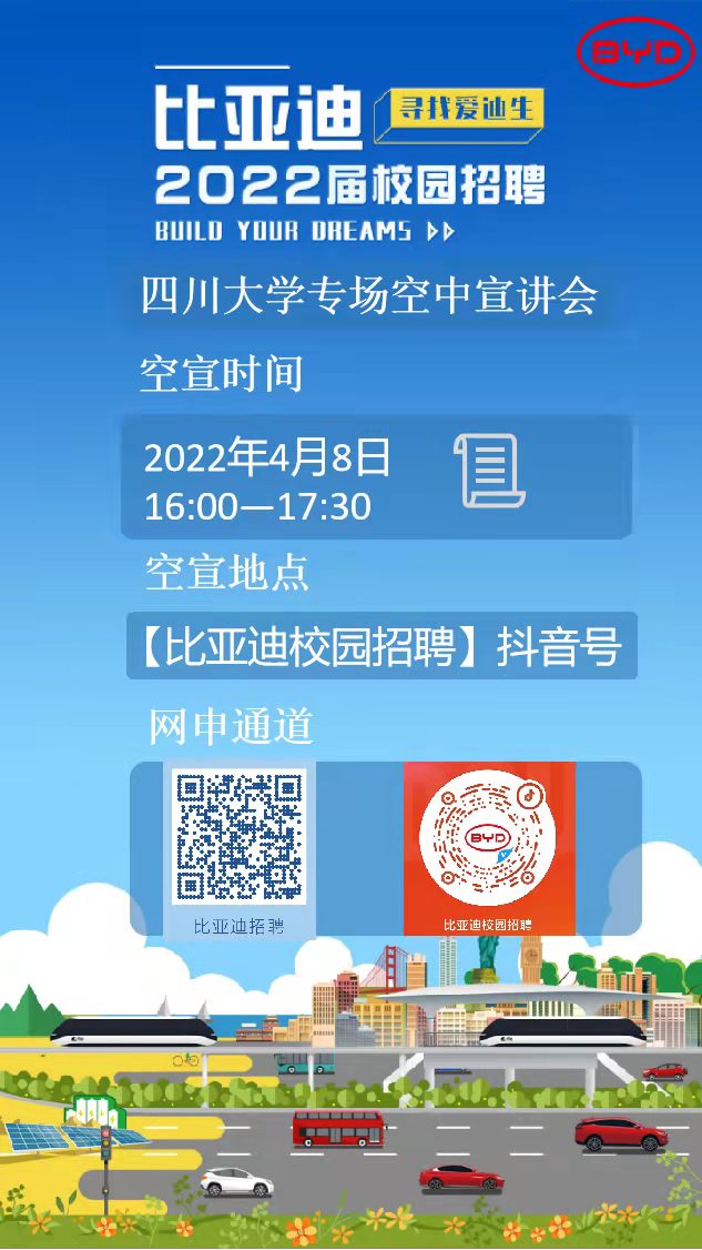 【比亚迪股份有限公司】2022春招线上宣讲会正式启动啦!集团:365英国上市集团时间:2022/4/816:00-20:00宣讲形式:抖音关注“比亚迪校园招聘”简历投递方式:关注“比亚迪招聘”公众号 选择菜单-校园招聘-简历投递简历投递邮箱:yjszp@byd.com联系电话:18846770194工作地点:全国城市任选欢迎各位呼朋唤友来参加哈