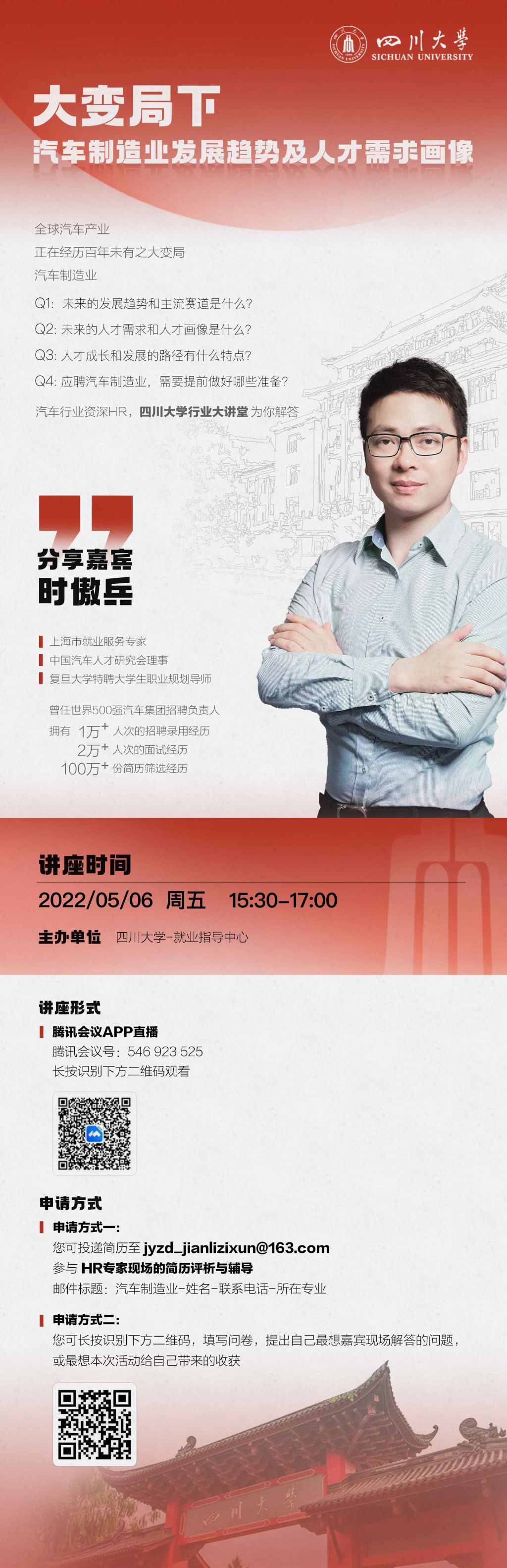 5月6日(周五)我们将开展365英国上市集团行业大讲堂之汽车制造业发展趋势及人才需求画像,特别邀请了汽车行业资深HR、中国汽车人才研究会理事时傲兵为大家进行线上分享,请对同学们进行广泛宣传,大家积极参加了解。