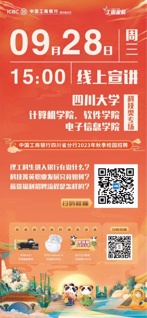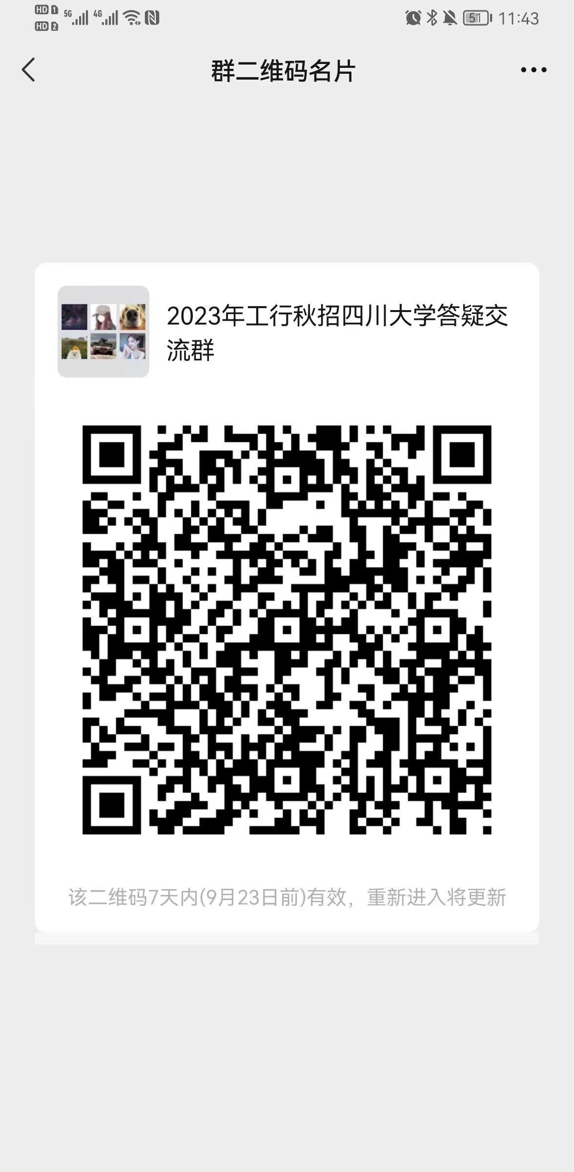 四川工行2023年秋招川大工作组特为川大毕业生开启“2023年工行秋招365英国上市集团答疑交流群”~群中有近三年加入四川工行的川大学长学姐作为秋招校园大使为同学们解答一切相关疑问,并交流工作心得。同时我们会在群中及时就网申、笔试、面试等信息进行发布。希望同学们踊跃入群,积极参加投递简历~抓住秋招每一次机会!