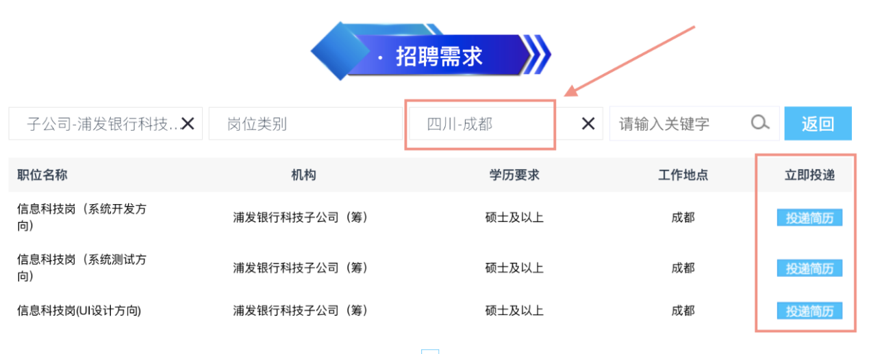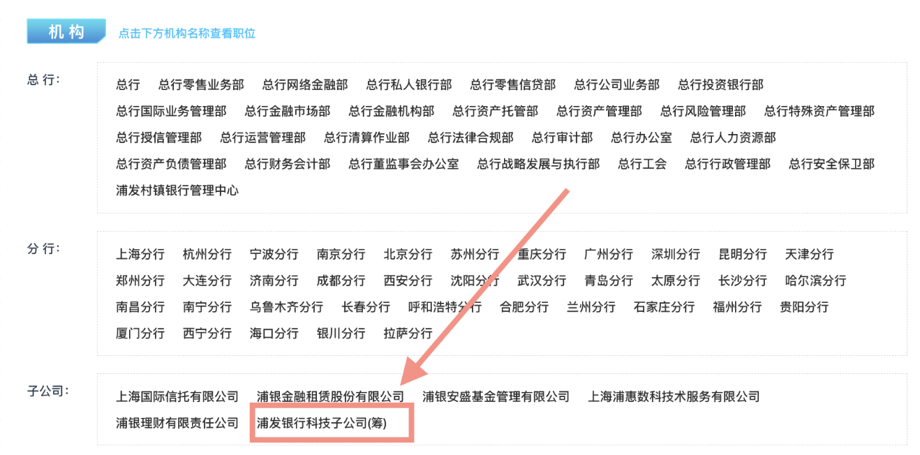 2.点击【招聘需求】【子公司】【浦发银行科技子公司(筹)】
