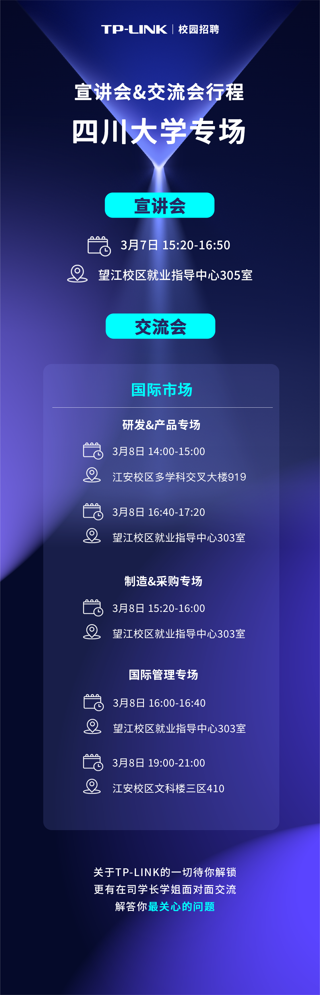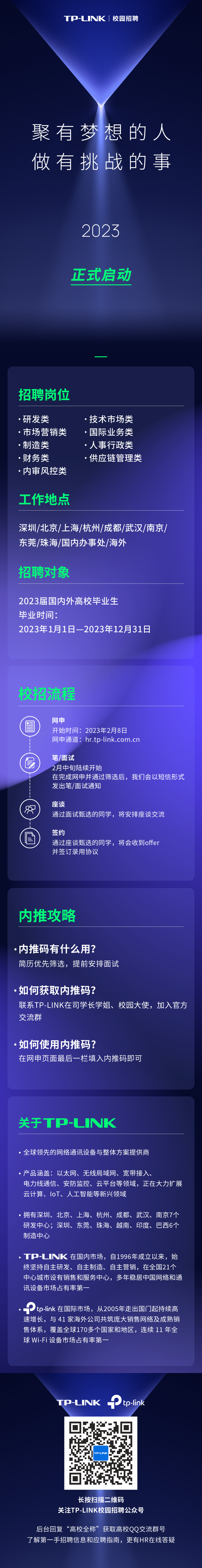 全球领先的网络通讯设备供应商TP-LINK春招正式启动, 从1996到2023,我们步履不停;从无线路由到人工智能,我们开拓不止;让科技走进你我,用产品改变世界。聚有梦想的人,做有挑战的事,我们在TP-LINK等你!