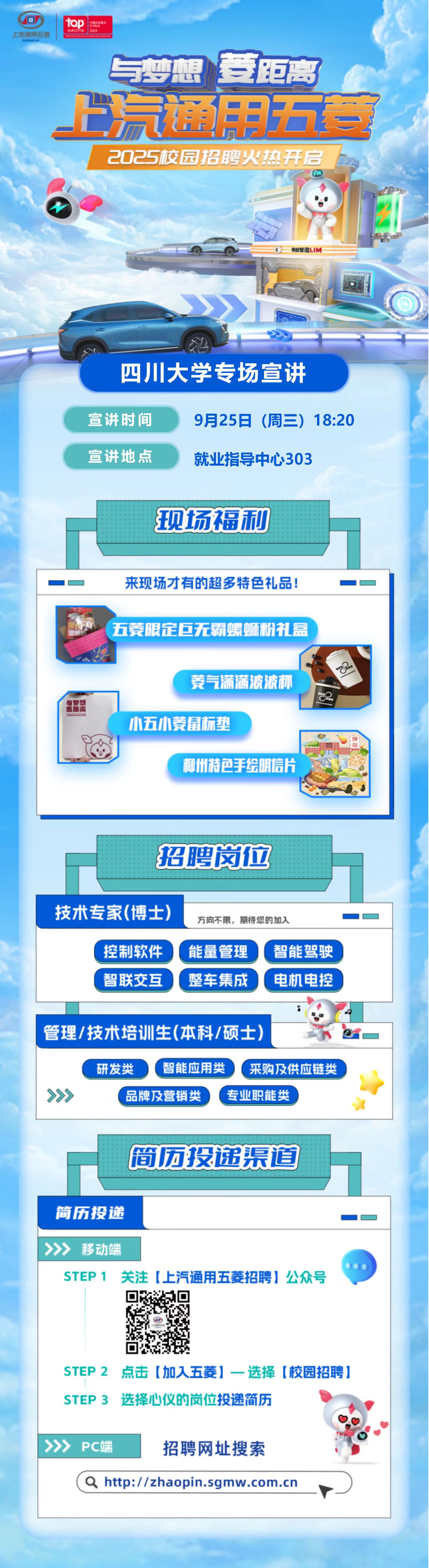 上汽通用五菱9月25日18点20在望江校区就业指导中心303进行专场宣讲会,请各位同学积极参加,现场有柳州城市特色伴手礼和奥运冠军同款螺蛳粉礼盒现场送出。