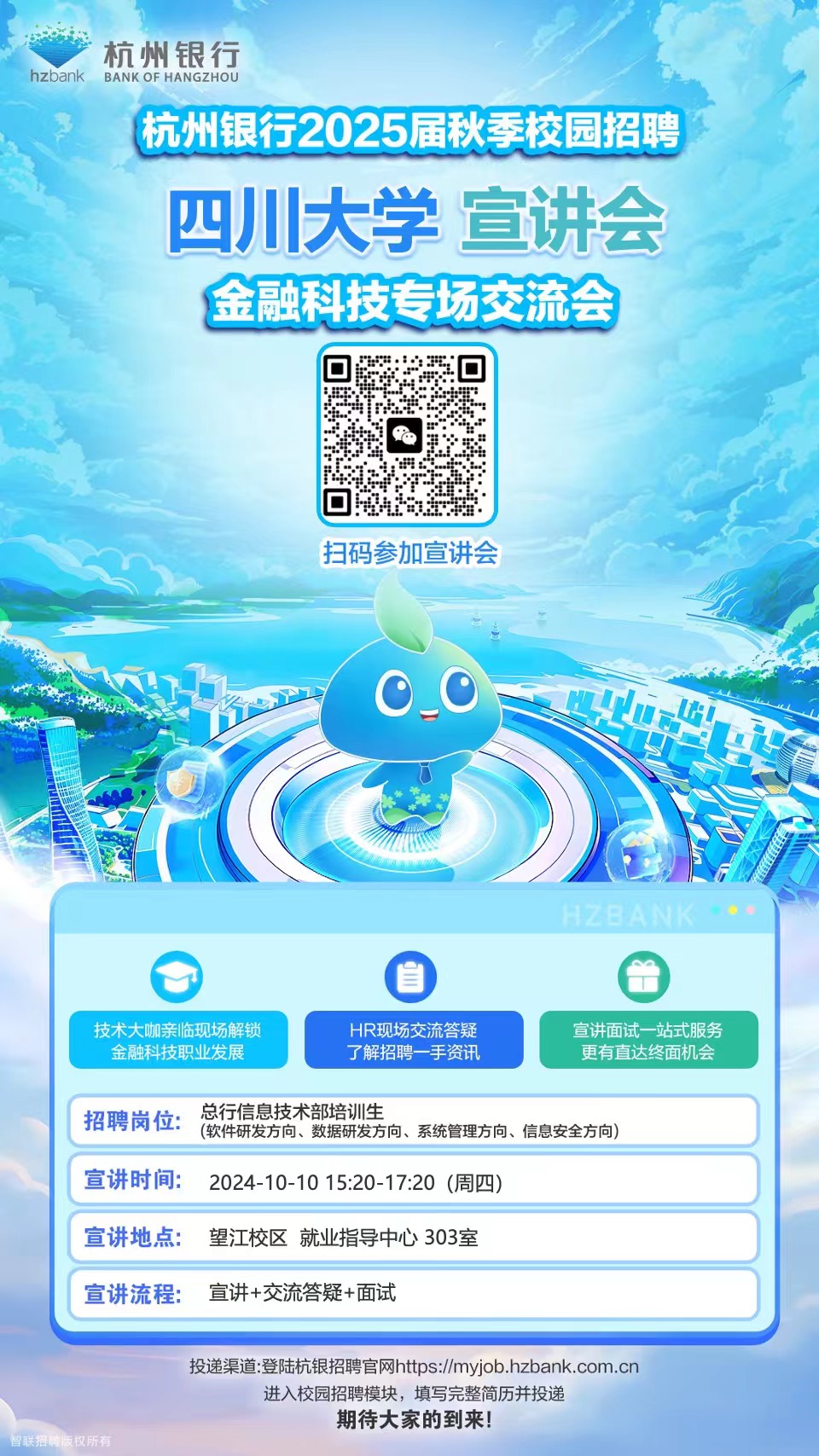 📭投递渠道:登陆杭银招聘官网https://myjob.hzbank.com.cn,进入校园招聘模块,搜索“信息技术培训生”填写完整简历并投递