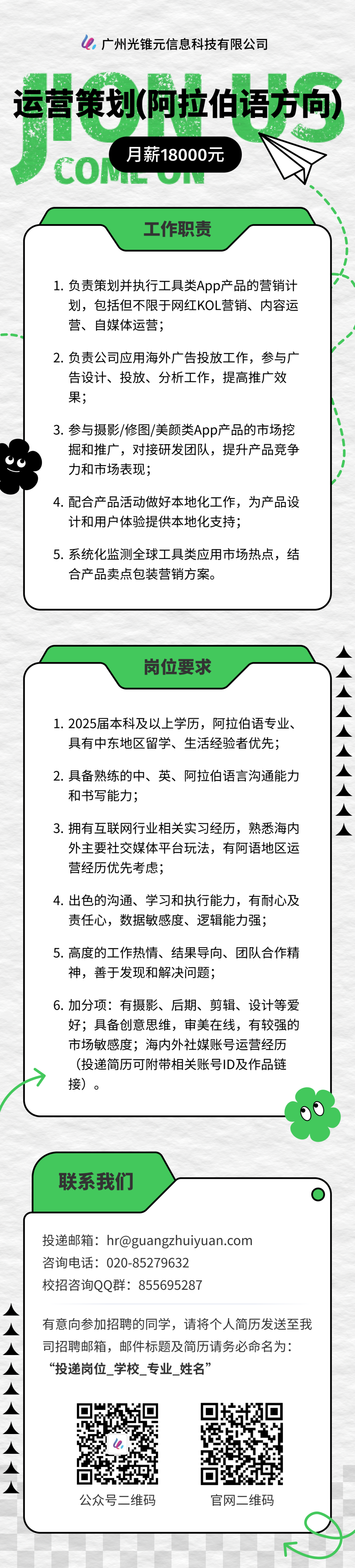 3、运营策划(阿拉伯语方向)(月薪18k+年终奖)限阿拉伯语专业