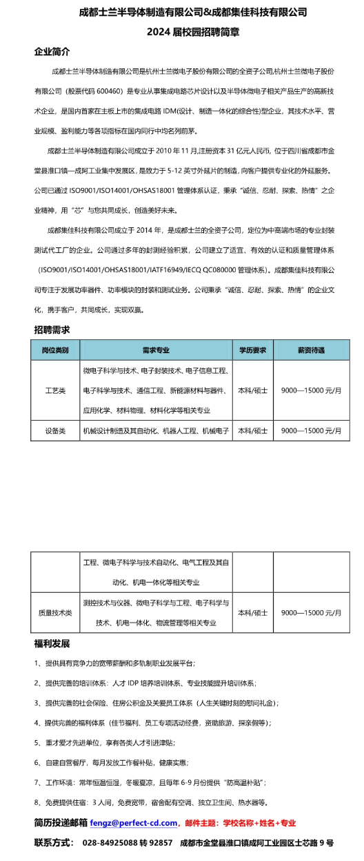 成都集佳科技有限公司成立于2015年,是成都士兰的全资子公司,定位为中高端市场的专业封装测试代工厂的企业。公司通过多年的封测经验积累,公司建立了适宜、有效的认证和质量管理体系(ISO9001/ISO14001/OHSAS18001/IATF16949/IECQ QC080000管理体系)。成都集佳科技有限公司专注于发展功率器件、功率模块的封装和测试业务。公司秉承“诚信、忍耐、探索、热情”的企业文化,携手客户,共同成长,实现双赢。