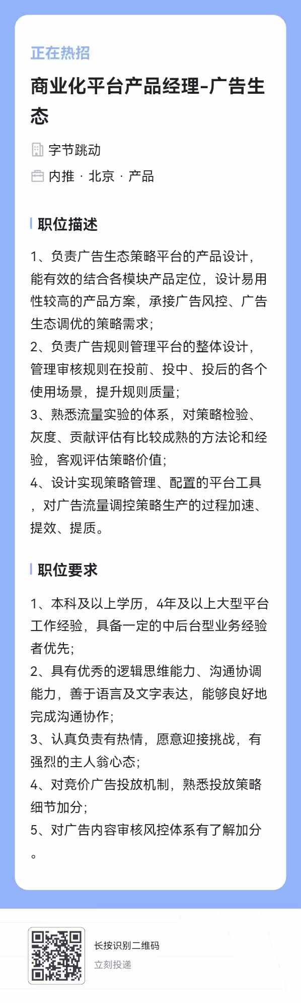 在字节的公司2018级硕士王员工(微信wy731505024)发消息,招26年毕业的校招生、实习生(可转正),以及社招商业平台产品经理,有看机会的同学或朋友欢迎推荐
